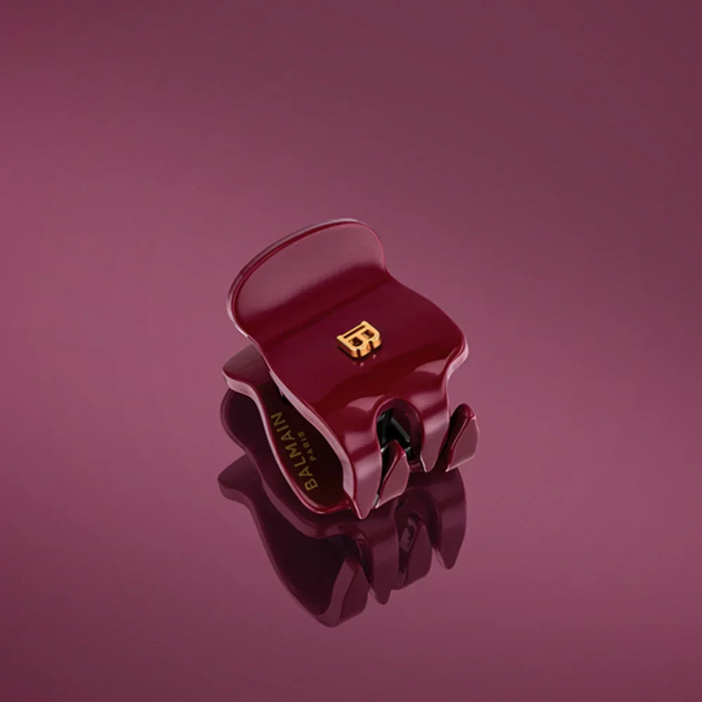An extra small, handmade claw clip made of durable velvet burgundy cellulose acetate. Designed with a sophisticated ivory coloured edge and the house's signature 18K gold-plated "B" logo. The extremely strong yet flexible material is hypoallergenic and gentle on the hair and scalp. The revolutionary clip mechanism provides perfect grip and prevents the hair accessory from slipping out of the hair. Perfect for all hair types.